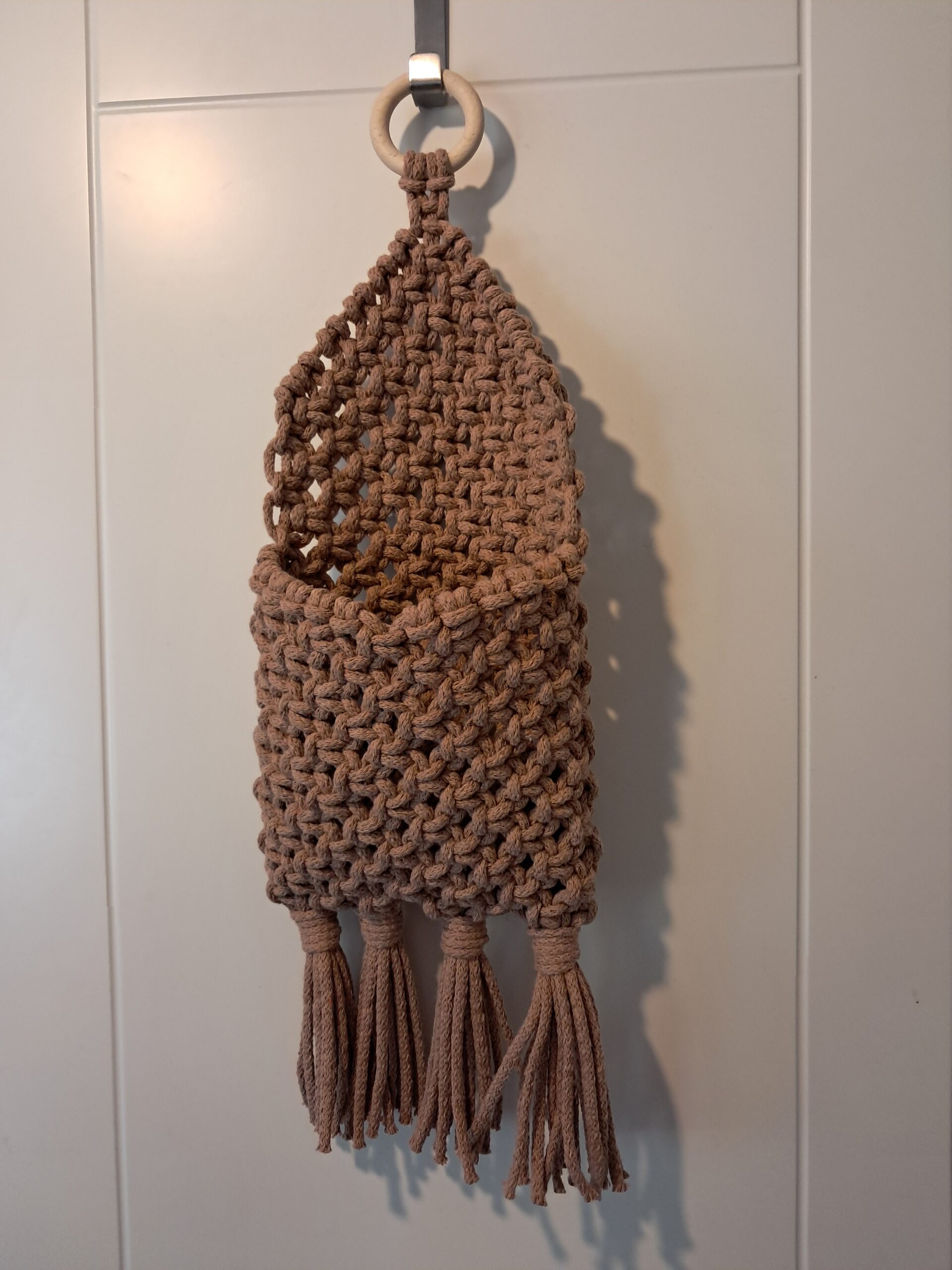 Makramee seinätasku puurenkaalla. Kauniiseen beigen väriseen seinätaskuun mahtuu esimerkiksi lempikirjasi.