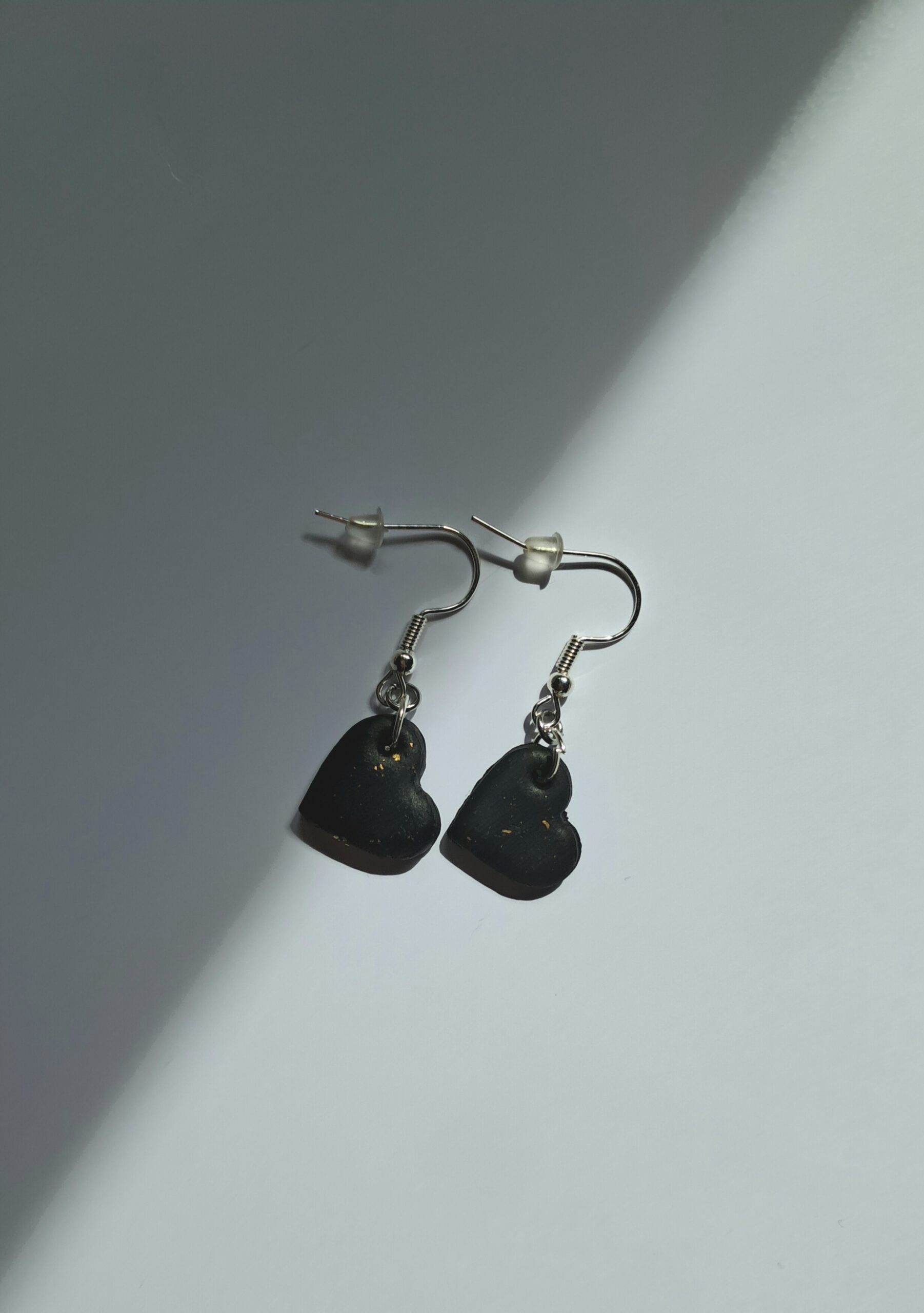 Fimomassasta tehdyt sirot mustat sydämet, joissa kultaisia pilkkuja. Koukut ovat nikkelivapaat, joissa silikooniset tapit. Sydänten leveys 1,5 cm ja korkeus 1 cm